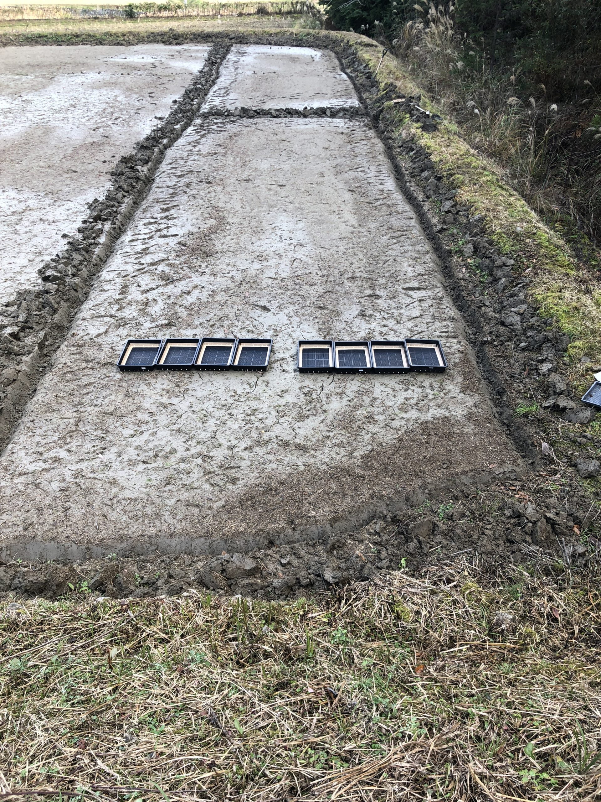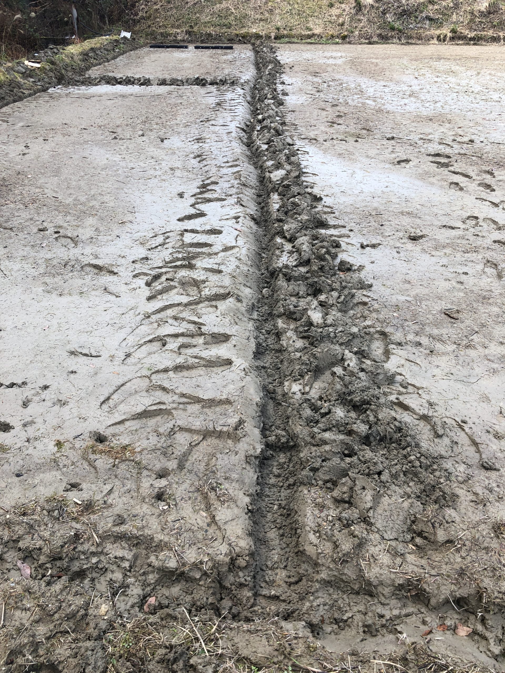 溝は田んぼの排水溝につなげています。排水を少しでも促すために。 また、栽培がスタートしたら圃場全体で給水できるようし、排水溝部分の排水レベルを調整することで圃場全体に給水を一気にできるように、という機能面も考えています。 果たしてその構想がうまくいくか…。実際に試してみたいですが、栽培に向けてはもう少し準備が必要なので、実際に入水して給水を試せるのはもう少し先の話ですね。