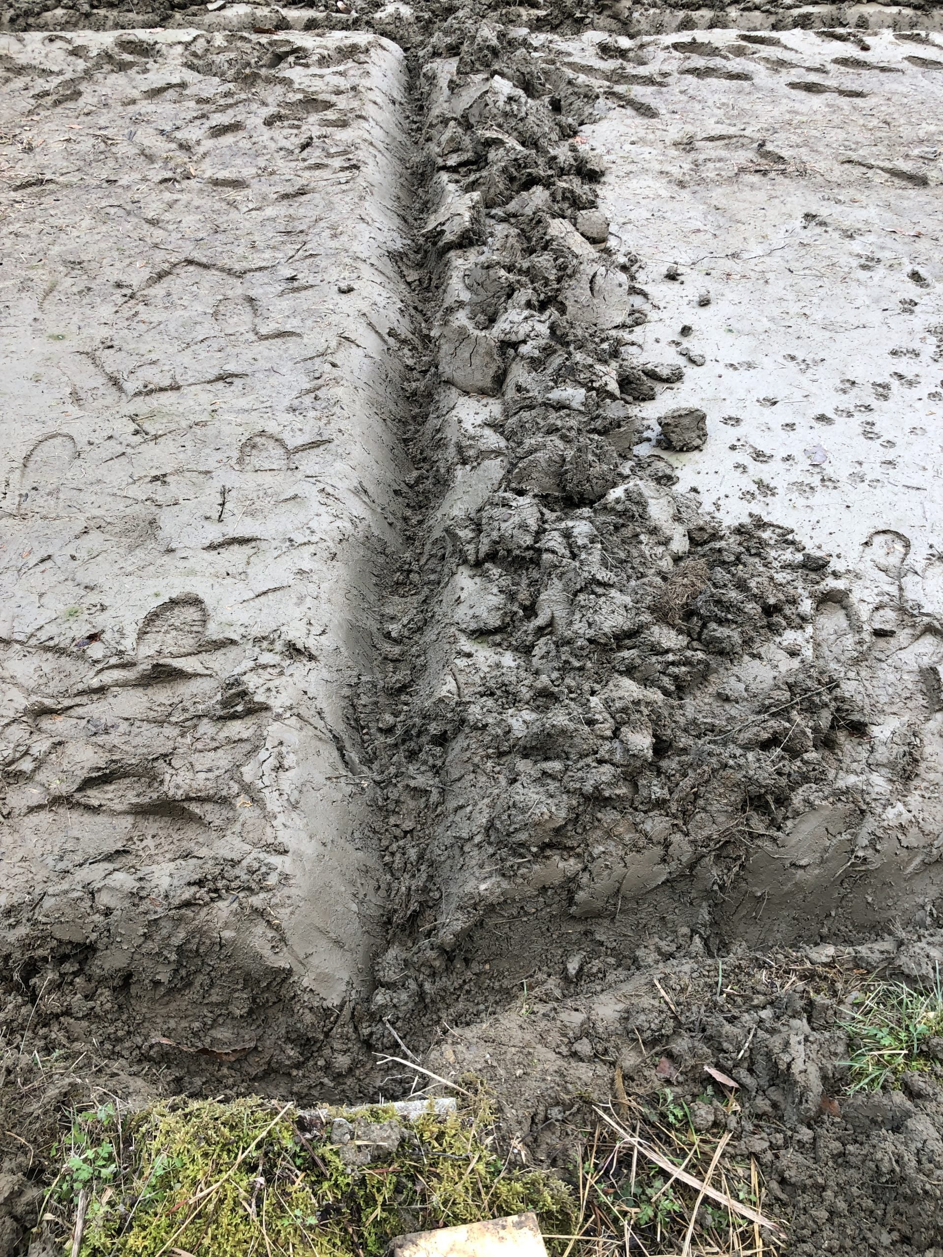 縦に一直線にも溝切り。 真ん中から手間にかけては特にまだぬかるんでいるので足跡もたくさん付きましたが、なんとか溝切りができました。 スコップでザクザクと溝の土を切るように溝の両側にVの字にスコップを入れ、ひとかきずつ地道に掘りました。 腰にめちゃくちゃ負担がかかる作業ですが、この区画の溝切り作業は2時間ほどで完了。